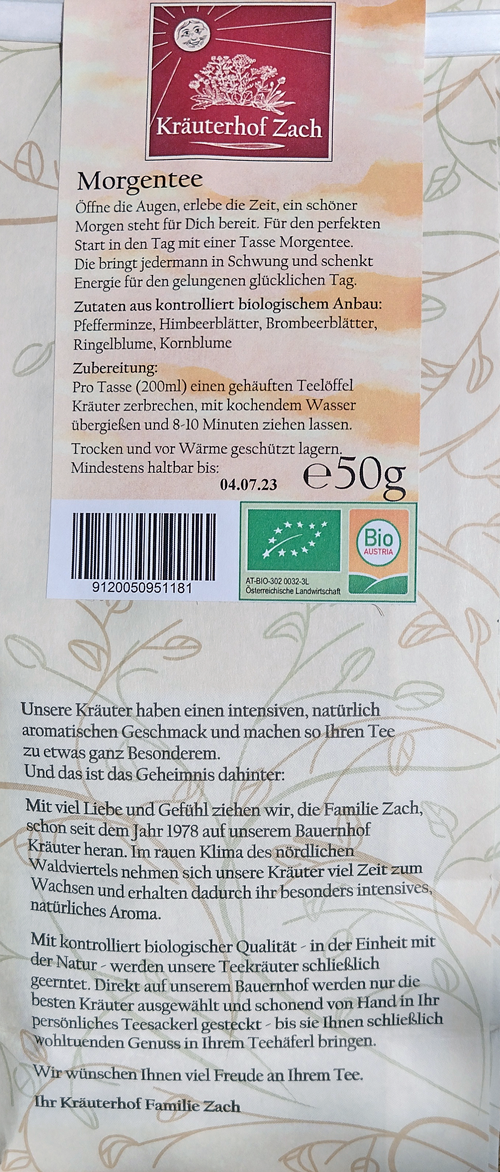 Unser Morgentee enthält die Kräuter Milde Minze, Pfefferminze, Him- und Brombeerblätter sowie Ringel- und Kornblume.
